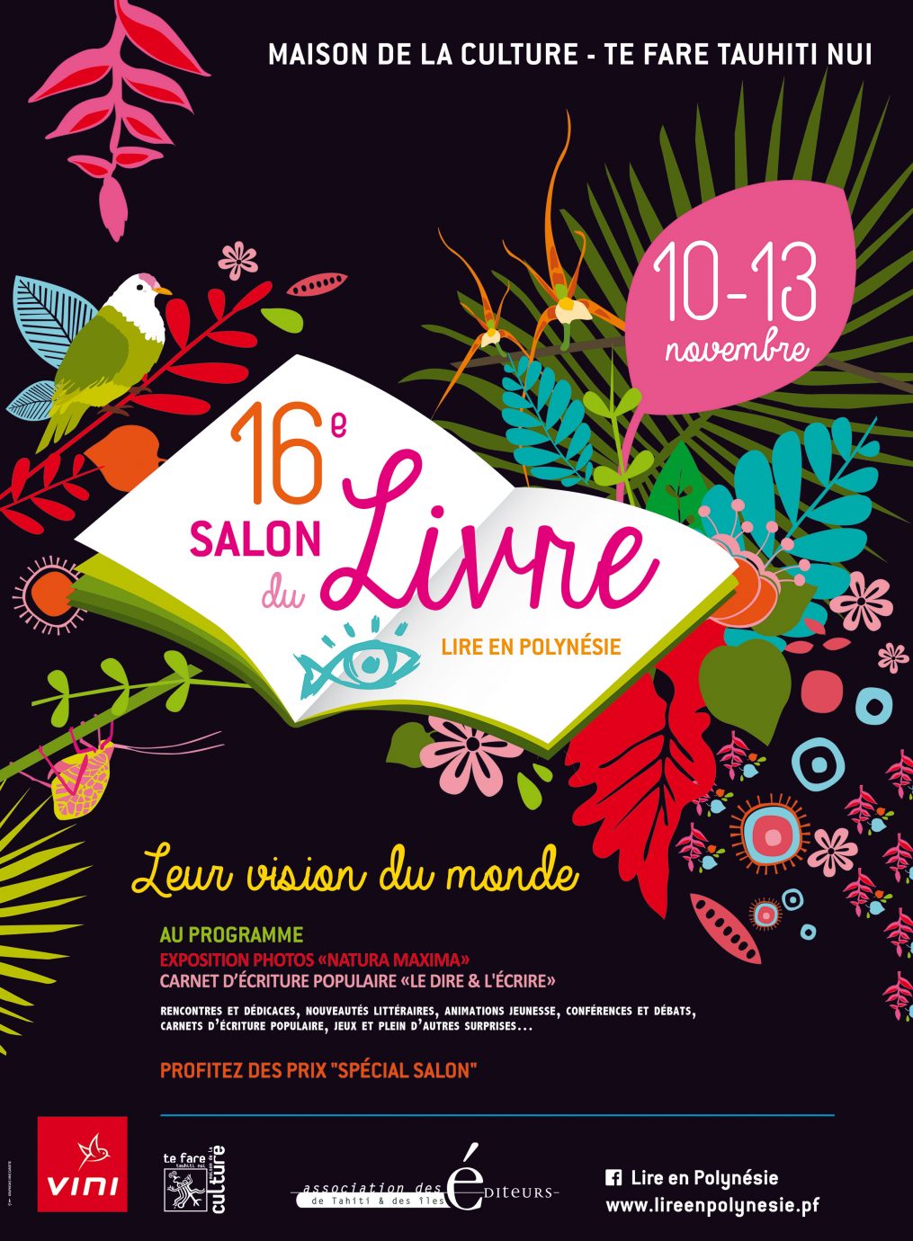 « Lire en Polynésie » est une belle occasion, pour notre littérature du Pacifique et ses lecteurs, de rencontrer la littérature d’ailleurs. Les échanges et les rencontres sont autant d’opportunités qui permettront à nos auteurs d’être connus et reconnus dans le Pacifique mais aussi au sein d’une littérature mondiale. Le 16ème Salon du Livre se tiendra à la Maison de la Culture du 10 au 13 novembre 2016.
