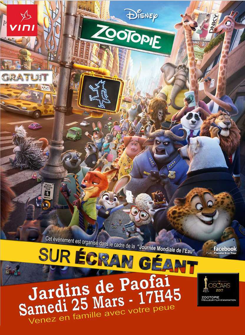 Et profitez d’un moment de détente en famille, en participant à la projection en plein air du film d’animations Zootopie, le samedi 25 mars 2017 à partir de 17h45 dans les Jardins de Paofai.