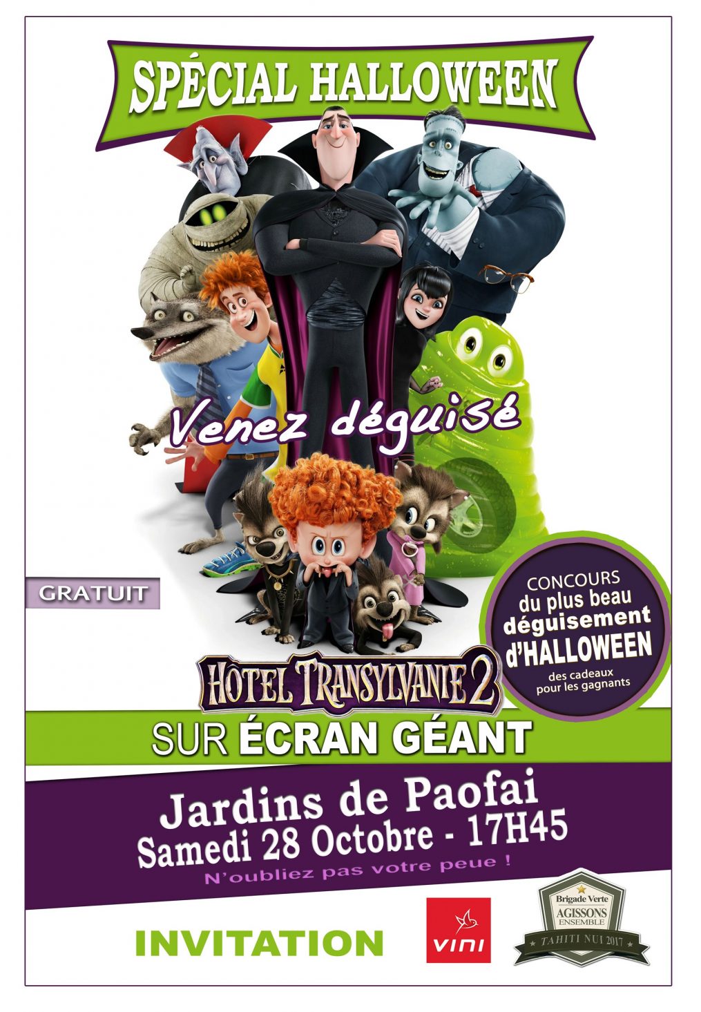 La Brigade Verte en partenariat avec Vini, organise une projection gratuite du film « Hôtel Transylvanie 2 » le samedi 28 octobre 2017 à partir de 17h45 dans les Jardins du parc Paofai. Pour cette dernière manifestation de l’année 2017, plusieurs animations éco citoyenne seront au programme ainsi qu’un concours du plus beau déguisement Halloween réaliser avec des objets du quotidien. Alors faites appel à votre imagination et votre créativité pour confectionner le plus effrayant des costumes Halloween !