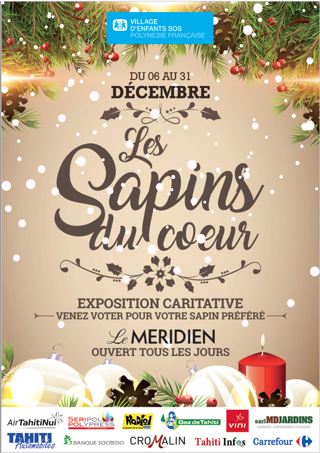 Venez nombreux voter pour votre sapin favori afin d’aider et soutenir les actions menées par l’association en faveur de jeunes enfants de Tahiti. Rendez-vous du 5 au 31 décembre à l’hôtel Le Méridien dans le hall d’entrée.