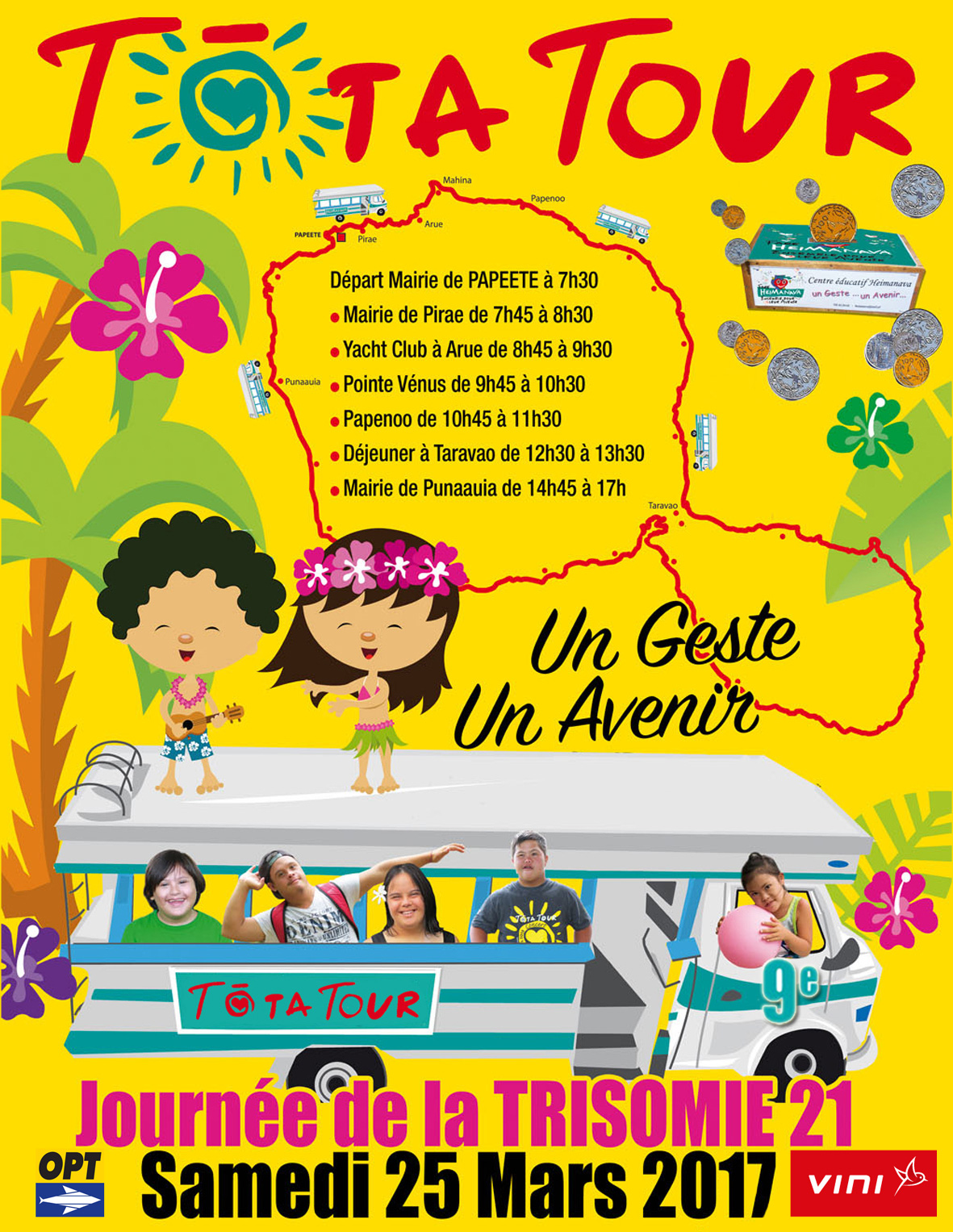 La traditionnelle collecte de fonds aura lieu durant tous le mois de mars. Si vous souhaitez aider cette structure d’accueil pour enfants porteurs de Trisomie 21, rendez-vous du 1er au 31 mars 2017 dans les boutiques Vini Fare Toby, Carrefour Punaauia et Carrefour Arue, où les urnes « Tota Tour » attendent vos dons.